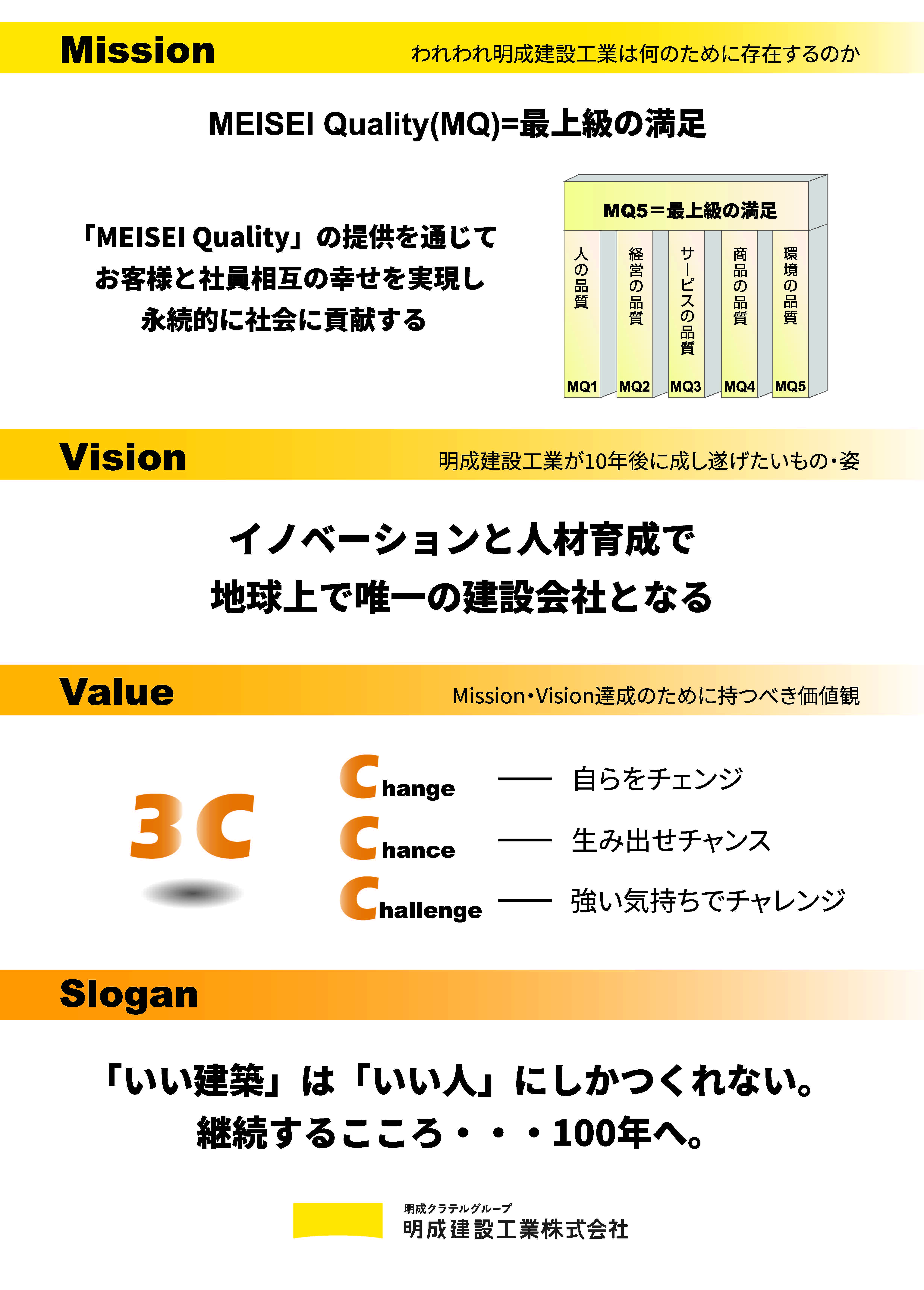 2026年に100周年を迎える明成建設工業が、お客様と社員全員にとってかけがえのない会社になるように努力してまいります。