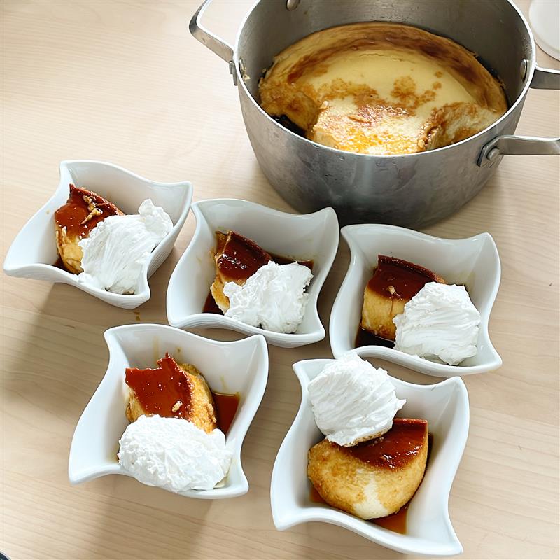 休日のおやつにプリン。子供が四人いるので、ご飯もおやつも作る量はいつも大量です。